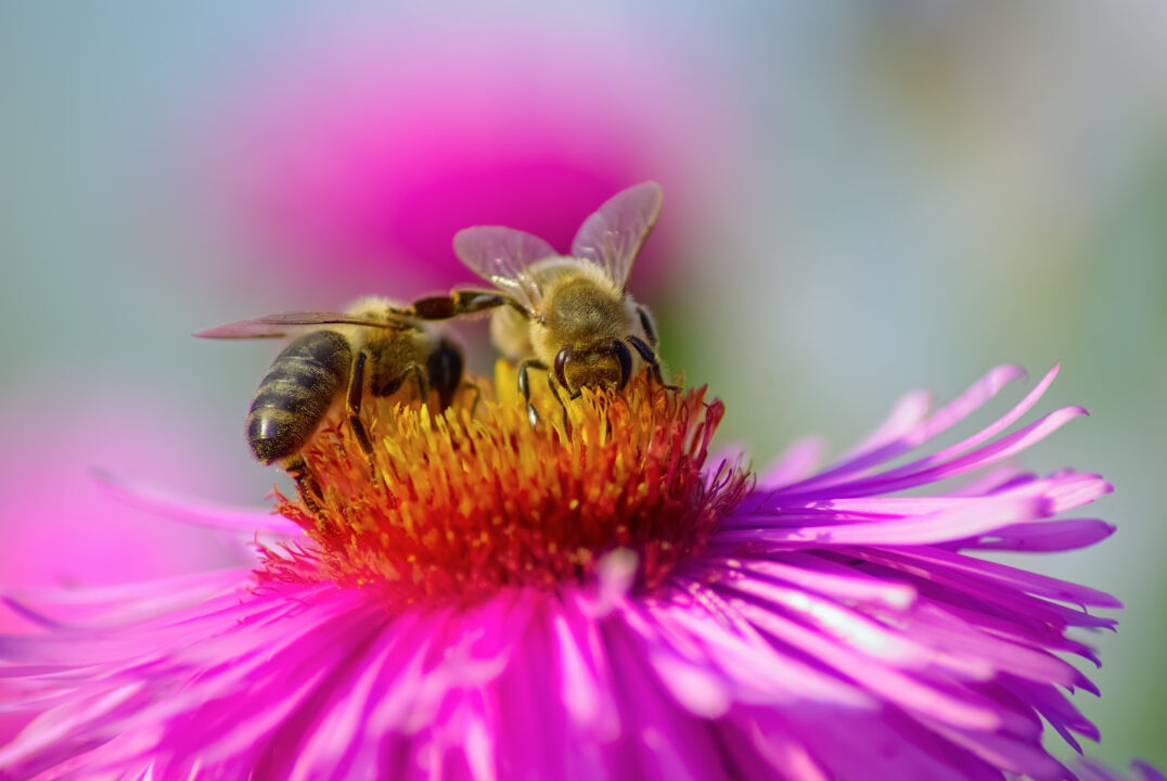 Two bees on a pink aster flower. Shallow depth of field. Selective focus.