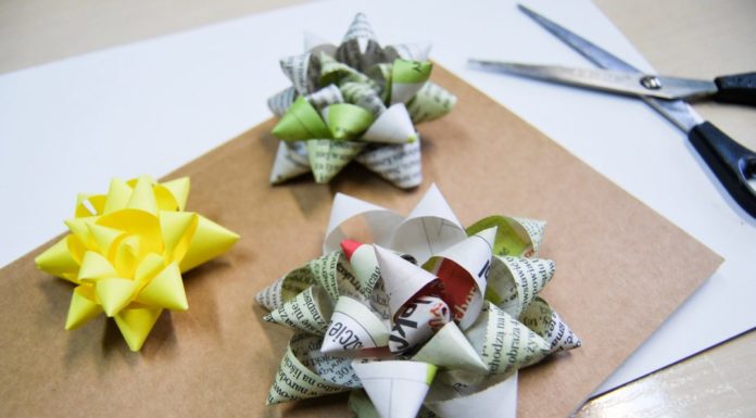 Zamiast kupowania sklepowych rozetek do przyozdabiania paczek/prezentów, zrób je własnoręcznie ze starych gazet, ulotek lub ścinek ozdobnego papieru!