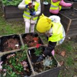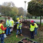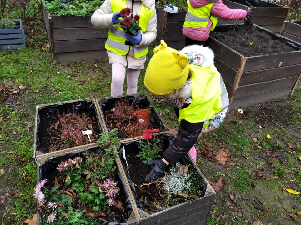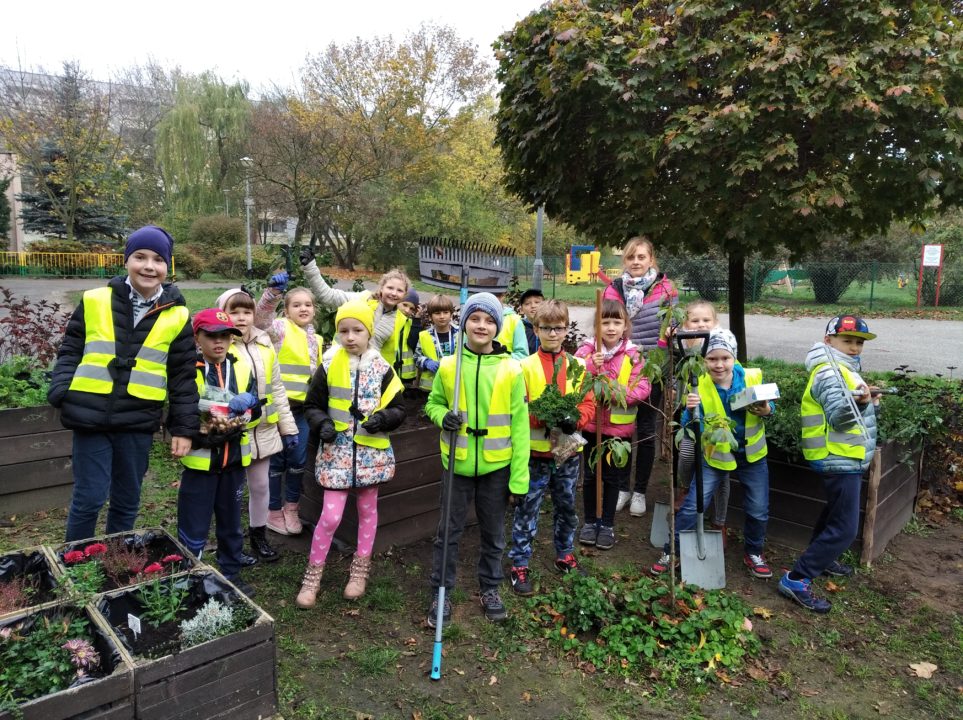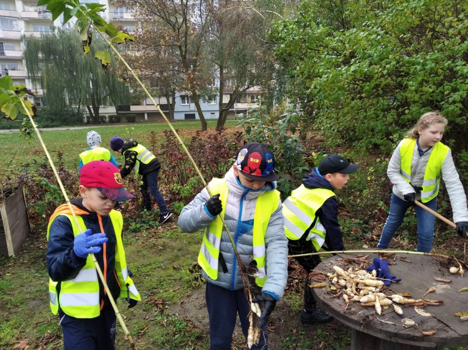 Klasa 25 października, robiła w ogrodzie jesienne porządki. Grabione były liście, usuwane wyschnięte rośliny oraz chwasty. W skrzyniach pojawiły się też nowe kwiaty. Największą atrakcją było jednak wykopanie topinamburu. Niektórzy z nich po raz pierwszy spotkali się z tą rośliną i z chęcią zabrali ją do domu by zasmakować jej w sałatce, zupie czy innym daniu. Ze skrzyń zostały zebrane również liście jarmużu. Z nich w klasie został przygotowany pyszny koktajl, który bardzo smakował małym ogrodnikom.