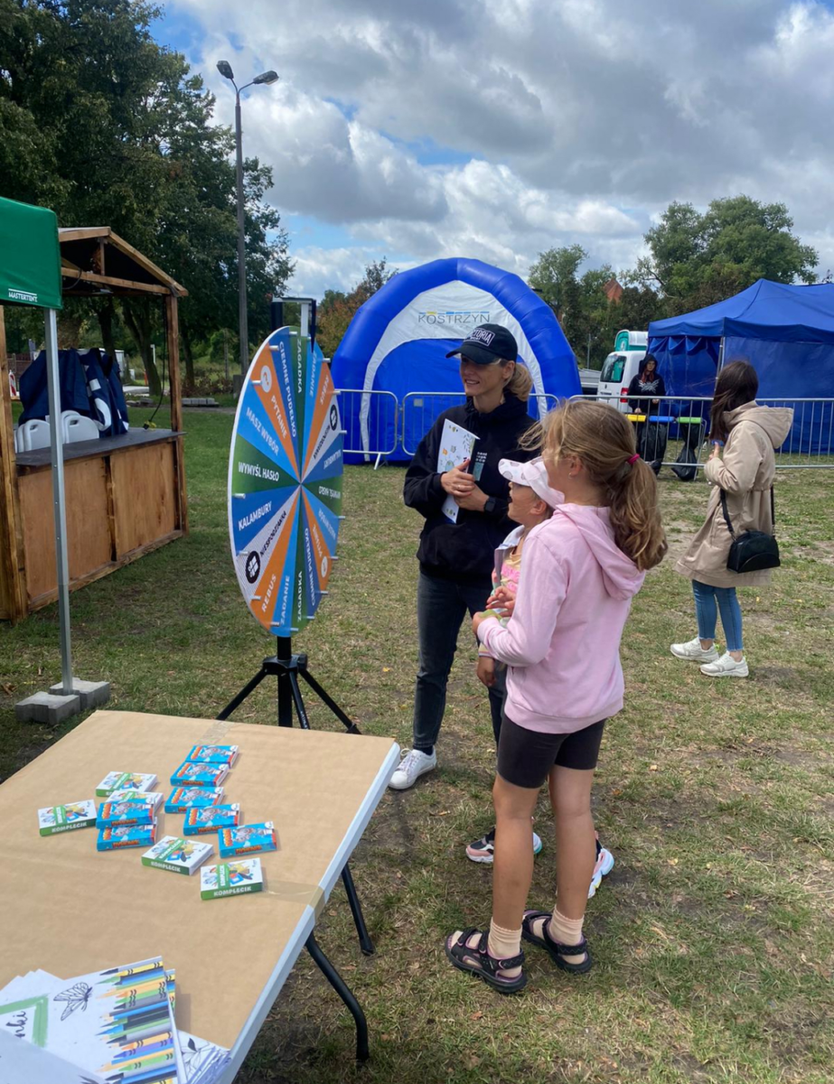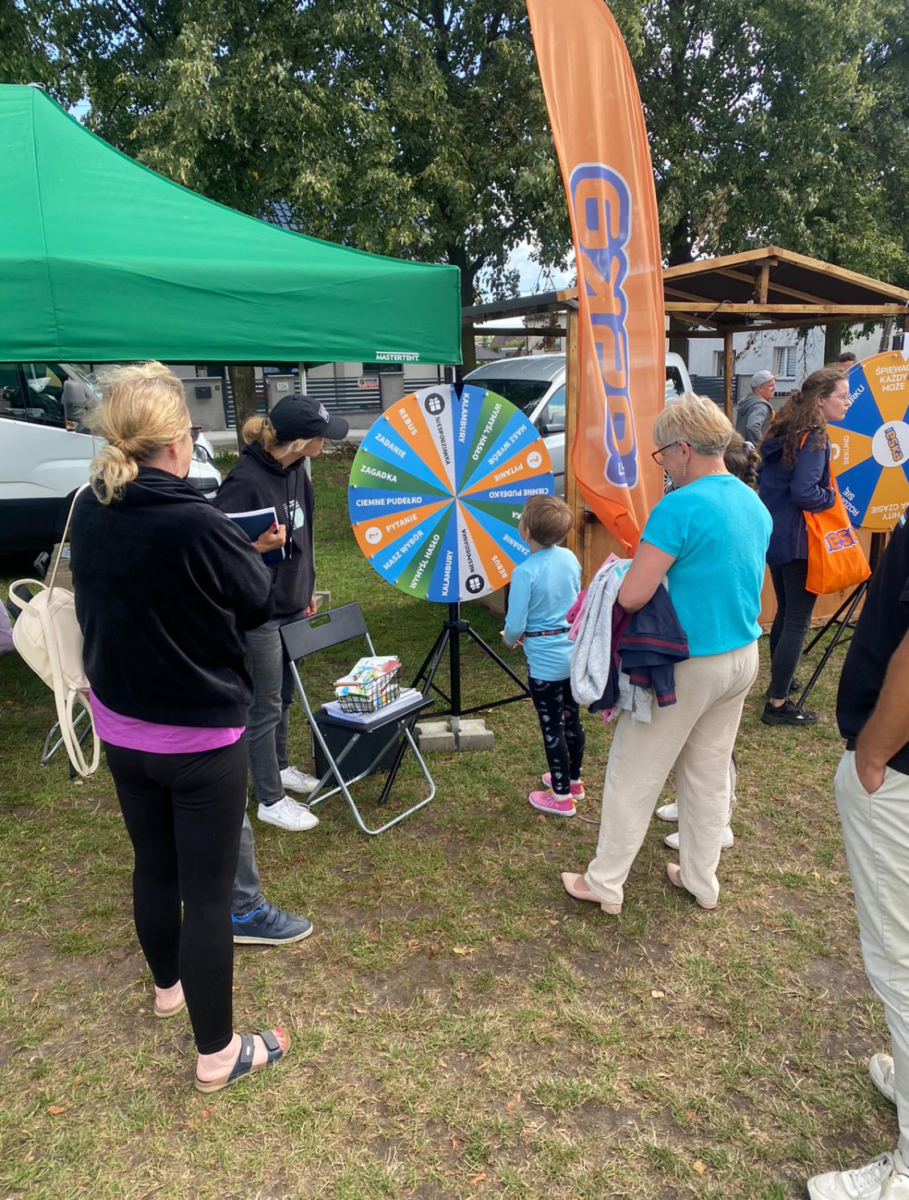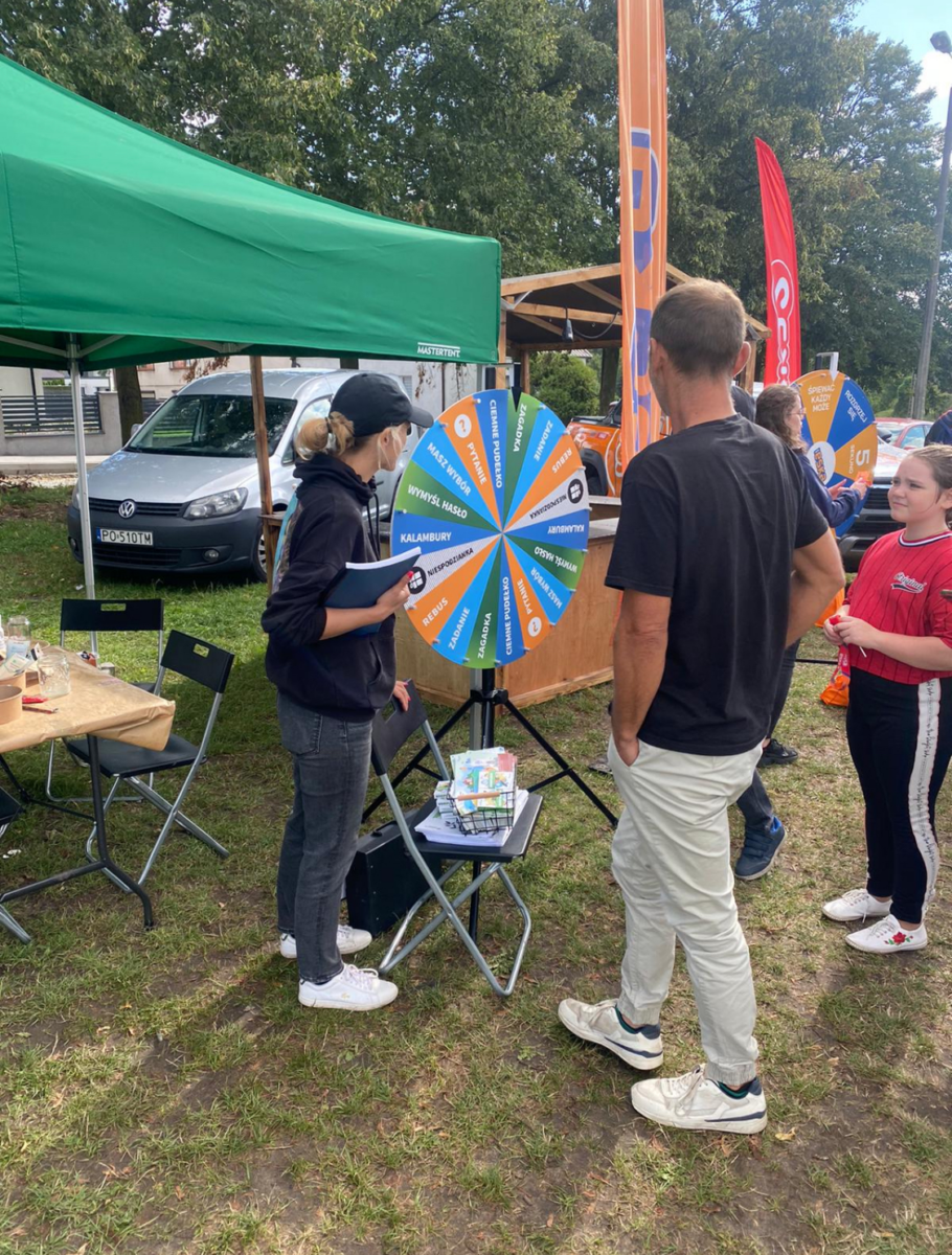 Nasze stoisko cieszyło się sporym zainteresowaniem, a koło fortuny sprawdzające wiedzę ekologiczną przyciągało zarówno dzieci, jak i dorosłych. Każdy, kto poprawnie odpowiedział na pytanie, mógł liczyć na drobny upominek, co dodatkowo motywowało do nauki i zabawy. Na wydarzeniu nie zabrakło również gier wielkoformatowych. „Twistor” oraz „Spacerkiem po wiedzę” dostarczyły uczestnikom mnóstwo atrakcji, a jednocześnie w przystępny sposób przybliżały tematy związane z ochroną środowiska.