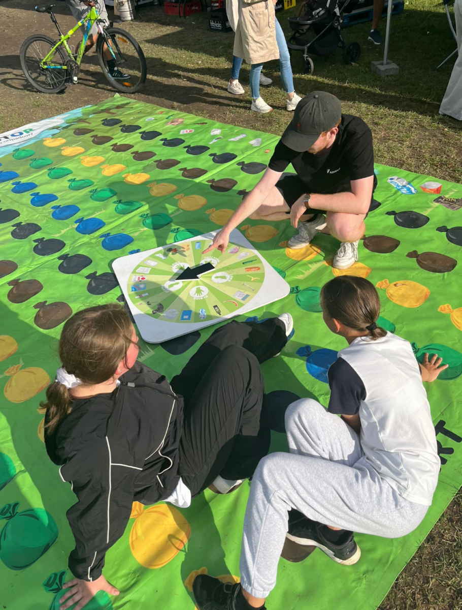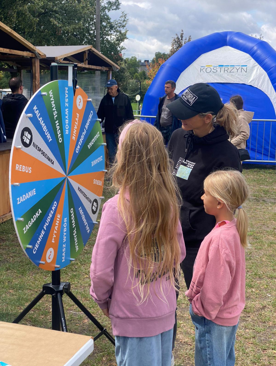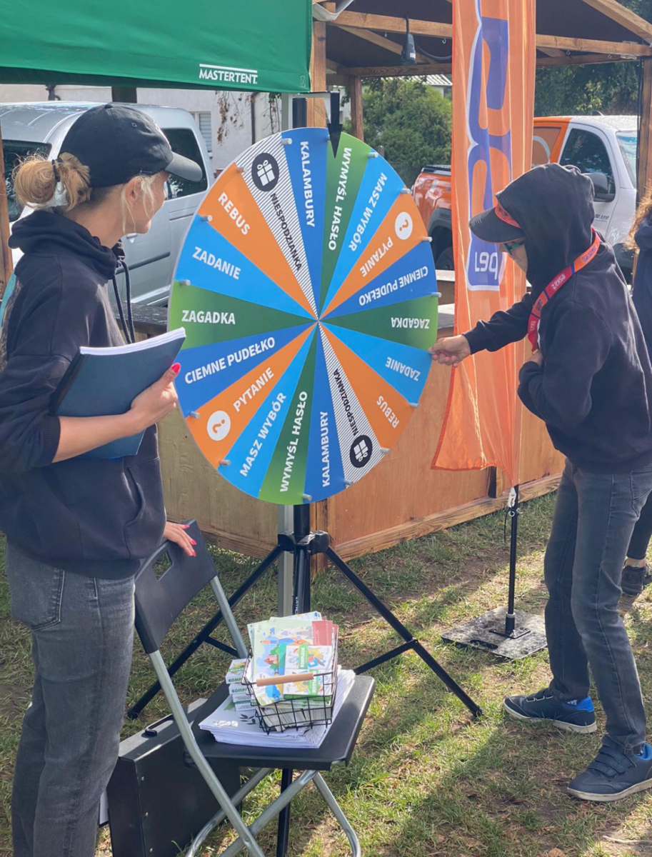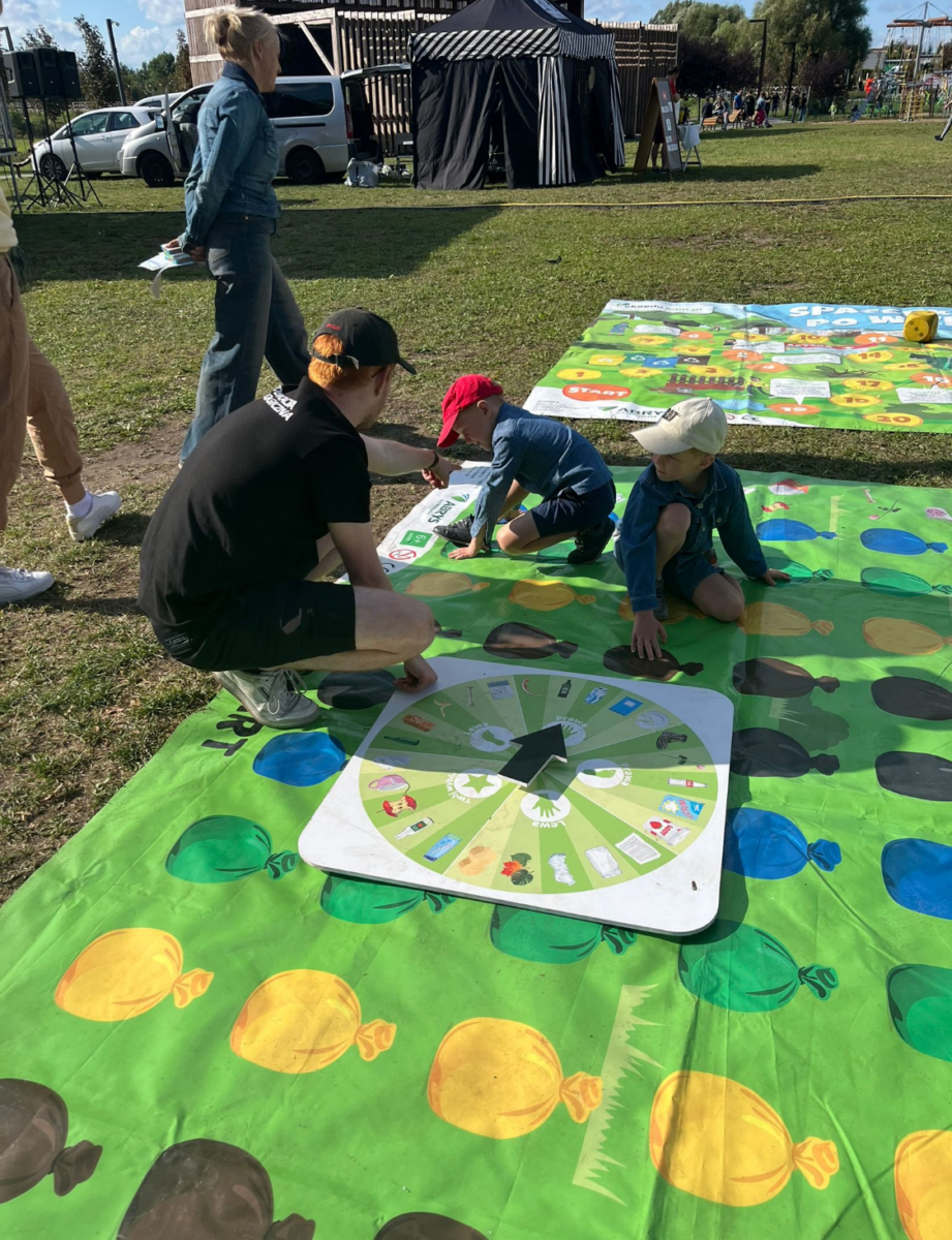 Nasze stoisko cieszyło się sporym zainteresowaniem, a koło fortuny sprawdzające wiedzę ekologiczną przyciągało zarówno dzieci, jak i dorosłych. Każdy, kto poprawnie odpowiedział na pytanie, mógł liczyć na drobny upominek, co dodatkowo motywowało do nauki i zabawy. Na wydarzeniu nie zabrakło również gier wielkoformatowych. „Twistor” oraz „Spacerkiem po wiedzę” dostarczyły uczestnikom mnóstwo atrakcji, a jednocześnie w przystępny sposób przybliżały tematy związane z ochroną środowiska.