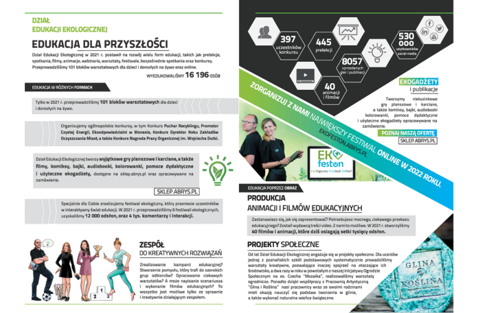 Nasze działania z zakresu edukacji ekologicznej w 2021 r. przede wszystkim obejmowały  tematy właściwej segregacji odpadów, recyklingu, gospodarki obiegu zamkniętego, efektywnego zarządzania zasobami, niskiej emisji, ochrony klimatu, ochrony bioróżnorodności pszczół, a także racjonalnej gospodarki wod-kan. W tym zakresie realizowane były projekty, obejmujące m.in. warsztaty, prelekcje, przedstawienia teatralne, spotkania z mieszkańcami, spoty filmowe, promocję w mediach społecznościowych, a także publikacje (komiksy, broszury, foldery, ulotki). Zdobyliśmy też ogromne doświadczenie w realizacji wydarzeń on-line. Możemy pochwalić się organizacją w tej formule webinarów, spotkań z mieszkańcami, festiwali ekologicznych, prelekcji, a także warsztatów edukacyjnych, obejmujących swoim zasięgiem ponad 4000 osób. Dzięki dofinansowaniu, uzyskanemu z Wojewódzkiego Funduszu Ochrony Środowiska i Gospodarki Wodnej w Poznaniu, zrealizowaliśmy też autorski projekt ” „Świadomi zmian zmieniamy się dla klimatu” , w ramach którego przygotowaliśmy materiały edukacyjne (komiks, biuletyn, filmy), nieodpłatnie udostępniane wszystkim zainteresowanym. Sporo miejsca w naszej działalności edukacyjnej zajmowała produkcja ekologicznych materiałów edukacyjnych: gier, książeczek, tablic, zestawów edukacyjnych (pojemniki, szafki edukacyjne), planów lekcji, kalendarzy, zakładek do książek, a także przyjaznych dla środowiska gadżetów.