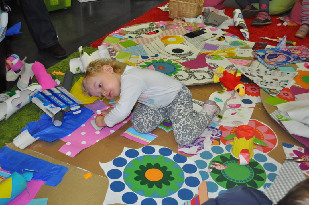 Z resztek tekstylnych i skarpet wszyscy chętni pod okiem Małgorzaty Szałajskiej (Anioł.pl) szyli skarpeciaki-przytulaki. W ramach warsztatów ?Cuda z opakowań?, prowadzonych przez Eko Akademię ZielonaLekcja.pl ?ożyły? odpady opakowaniowe – kubeczki po jogurtach, jako zajączki i kotki, a także – dźwięczne instrumenty muzyczne wypełnione grochem. Mali chłopcy z fascynacją tworzyli auta i roboty z tekturowych opakowań zbiorczych.